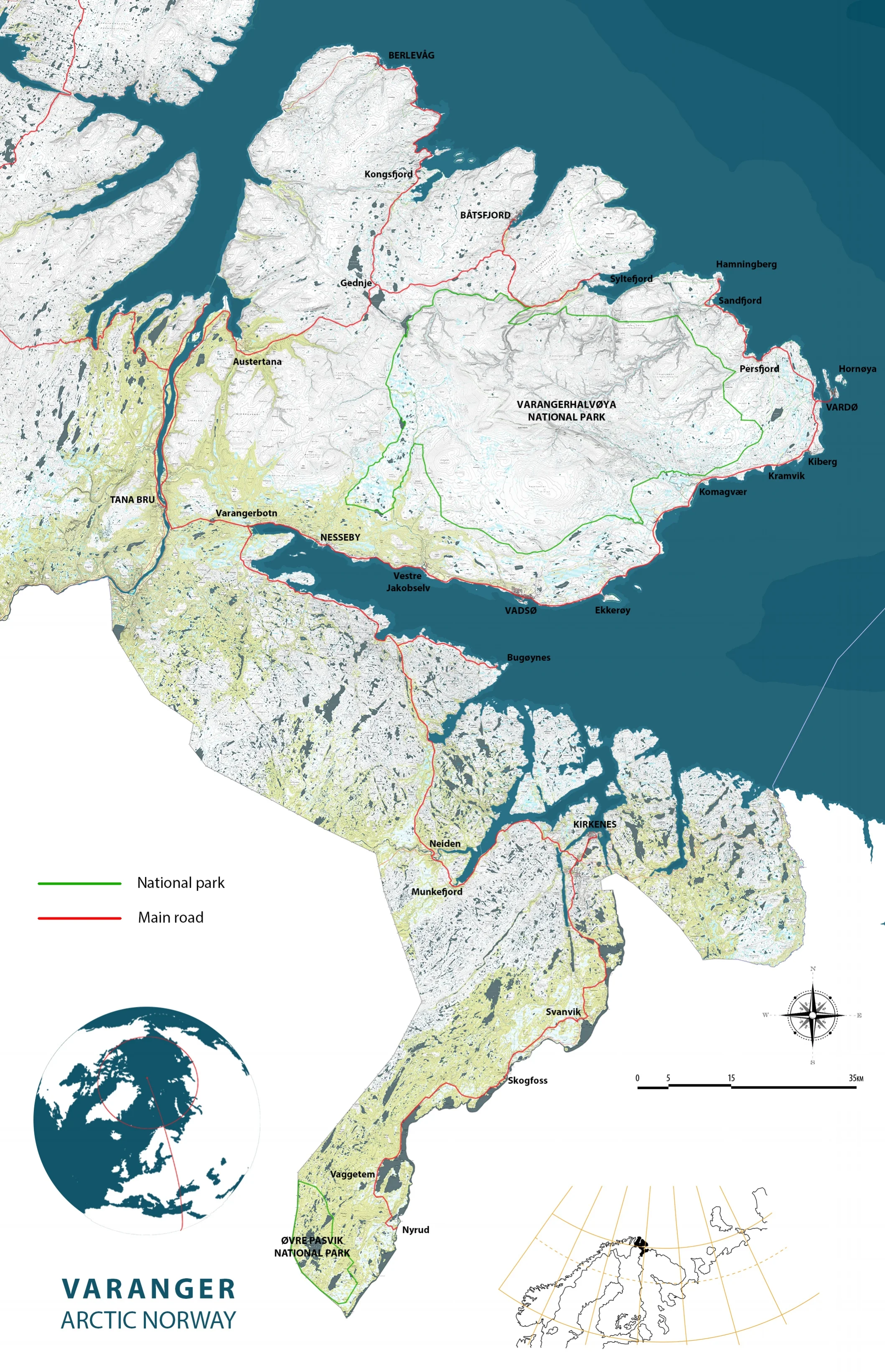 Während man den Süden der Varangerhalbinsel über Varangerbotn bereist, erreicht man den Norden von der Straße von Austertana. Diese führt entlang der hocharktischen Tundra Richtung Båtsfjord und Berlevåg. Das Flussdelta des Flusses Tana, gemeinsam mit Austertana ist eine der besten Vogelbeobachtungsregionen in Varanger, vor allem die Straße von Tana Bru Richtung Austertana.